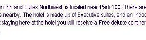 The Clarion Inn & Suites Northwest serves a deluxe continental breakfast every morning. Serving a wide range of dishes, Subway and HotBox Pizza can be reached within 12 minutes' walk.