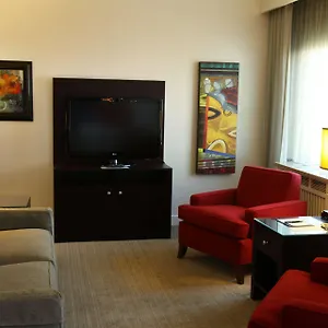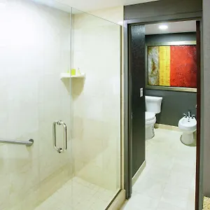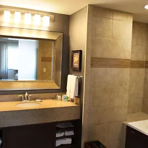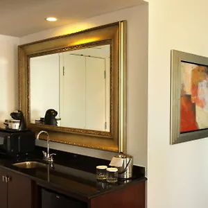 Bathrooms include a separate toilet and a bath, along with comforts such as hair dryers and bathrobes. Some units also boast downtown views.