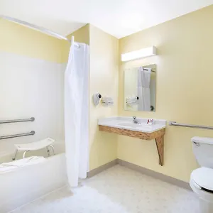 Guests can use a tub and a shower together with hair dryers and guest toiletries.