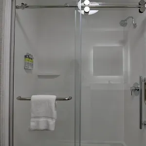 Guests can use a shower together with free toiletries and towels.
