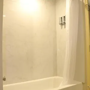A microwave and a refrigerator are standard in these rooms. Providing a tub and a shower, the bathrooms also have towels.