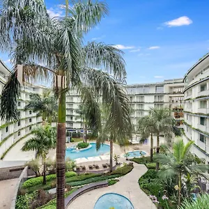 Guests can work out in a gym or relax by a swimming pool.