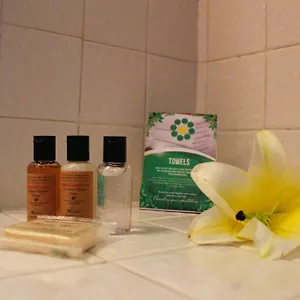 The private bathrooms are equipped with complimentary toiletries and towels.