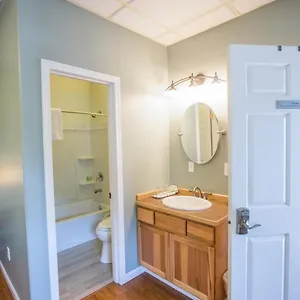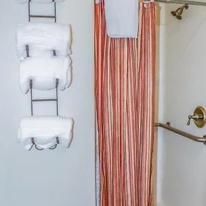The private bathrooms include a tub along with towels.