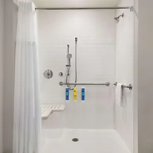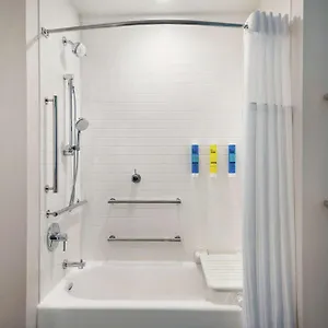 A tub and a roll in shower, together with such amenities as towels, are also at guests' disposal.
